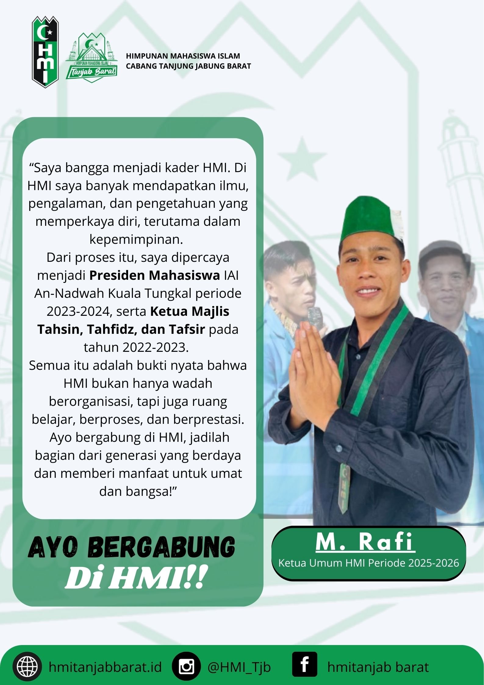 Di HMI, kita tidak hanya diajarkan teori kepemimpinan, tetapi juga ditempa langsung dalam ruang pengabdian, diskusi, dan aksi nyata.Bergabung di HMI berarti membuka diri pada jaringan yang luas,dari mahasiswa, akademisi, hingga tokoh nasional yang pernah ditempa di HMI.