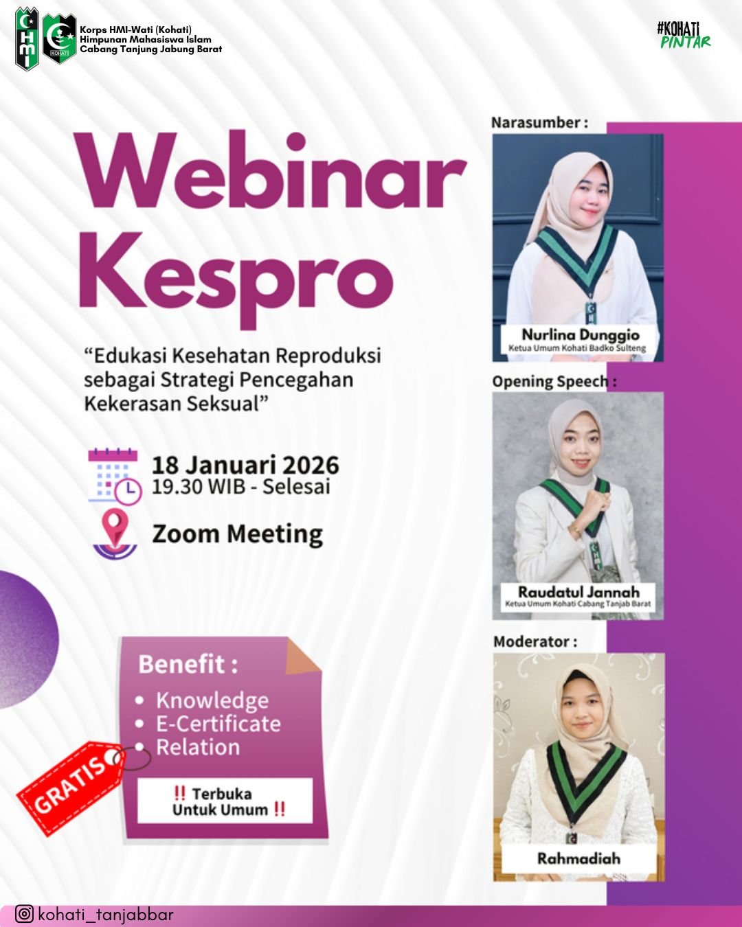 Kohati HMI Cabang Tanjung Jabung Barat kembali menghadirkan ruang edukatif melalui Webinar Kesehatan Reproduksi (Kespro) yang diselenggarakan pada Sabtu, 18 Januari 2026, pukul 19.30 WIB hingga selesai secara Zoom Meeting.